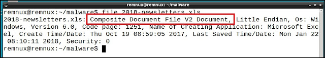 Once more, I used REMNux to statically analyze the file. Yes, I could have executed it with Lazy Office Analyzer to speed up my analysis, but frankly my Windows VM is temporarily fubar'd, so I was stuck doing it this way.